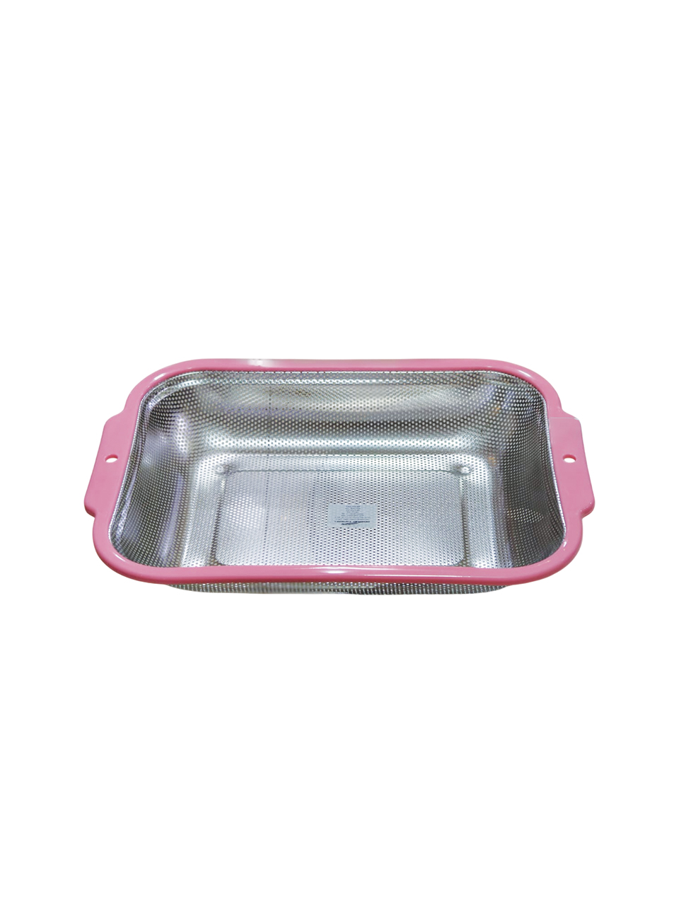 مصفاة مستطيلة الشكل مصنوعة من الفولاذ المقاوم للصدأ، مزودة بإطار ومقابض بلاستيكية وردية اللون لحمايتها.