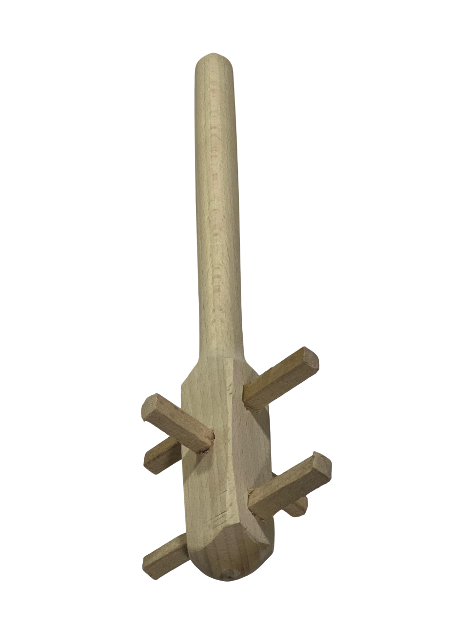 التصميم: تتكون من مقبض طويل وقاعدة مميزة مزودة بأوتاد خشبية بارزة .