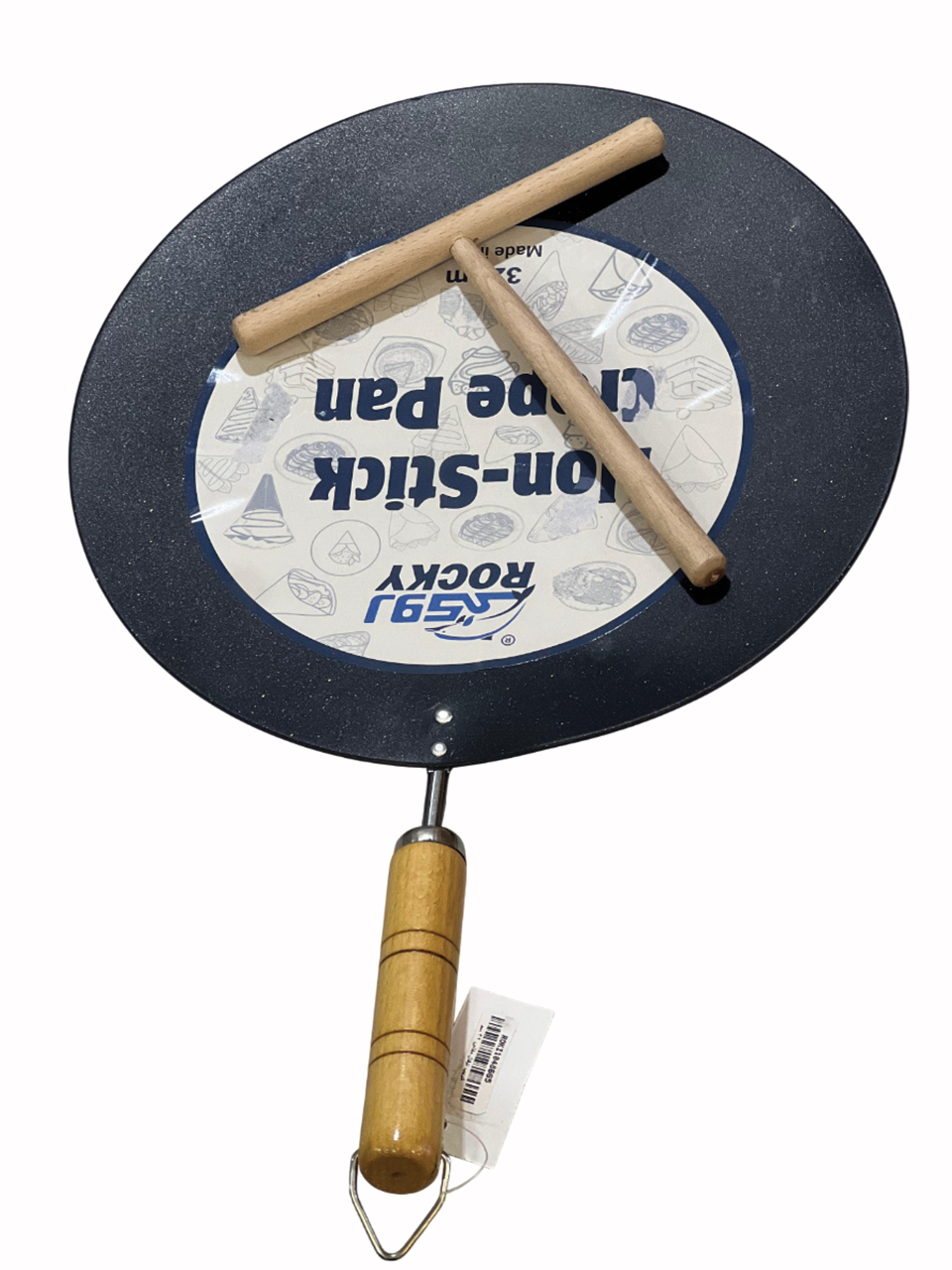مكونات المجموعة: تأتي المقلاة مع موزّع خشبي على شكل حرف T لتوزيع العجين بالتساوي على السطح المسطح.