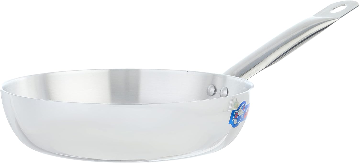 مقلاة ألومنيوم بمقبض من الفولاذ المقاوم للصدأ، معروفة بمتانتها وتوزيعها المتساوي للحرارة.