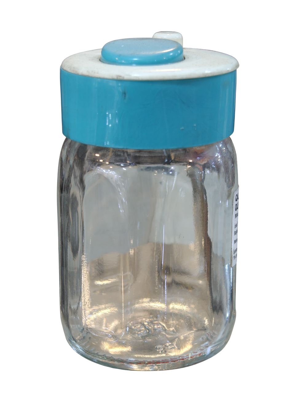 علبة ملح أو مرطبان توابل زجاجي صغير مماثل بغطاء بلاستيكي. تُستخدم هذه المرطبانات عادةً لتخزين وتوزيع مختلف أنواع التوابل والبهارات في المطبخ.