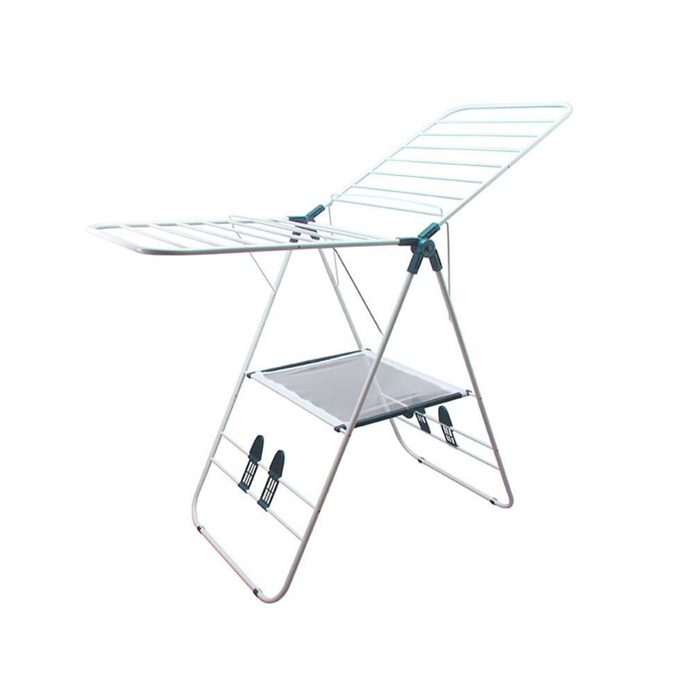 التصميم: يتميز الرف بجناحين رئيسيين لتعليق الملابس ورف شبكي أو صلب في المنتصف لتجفيف الملابس الرقيقة أو تخزين الأحذية.