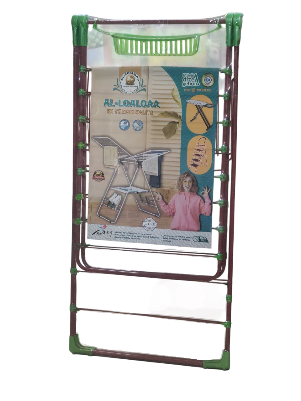 رف تجفيف الملابس. هو رف متعدد الطبقات قابل للطي، مصنوع على الأرجح من المعدن، بلون عنابي وأخضر، ومصمم للاستخدام الداخلي.
