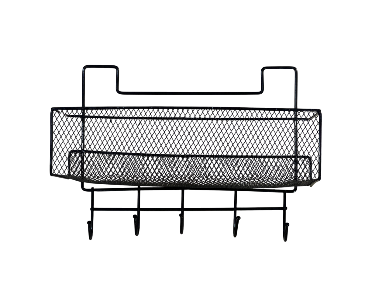 Design: Features a mesh basket for storing items such as cleaning supplies or kitchen utensils, plus a row of hooks at the bottom for hanging towels, keys, or pots and pans.