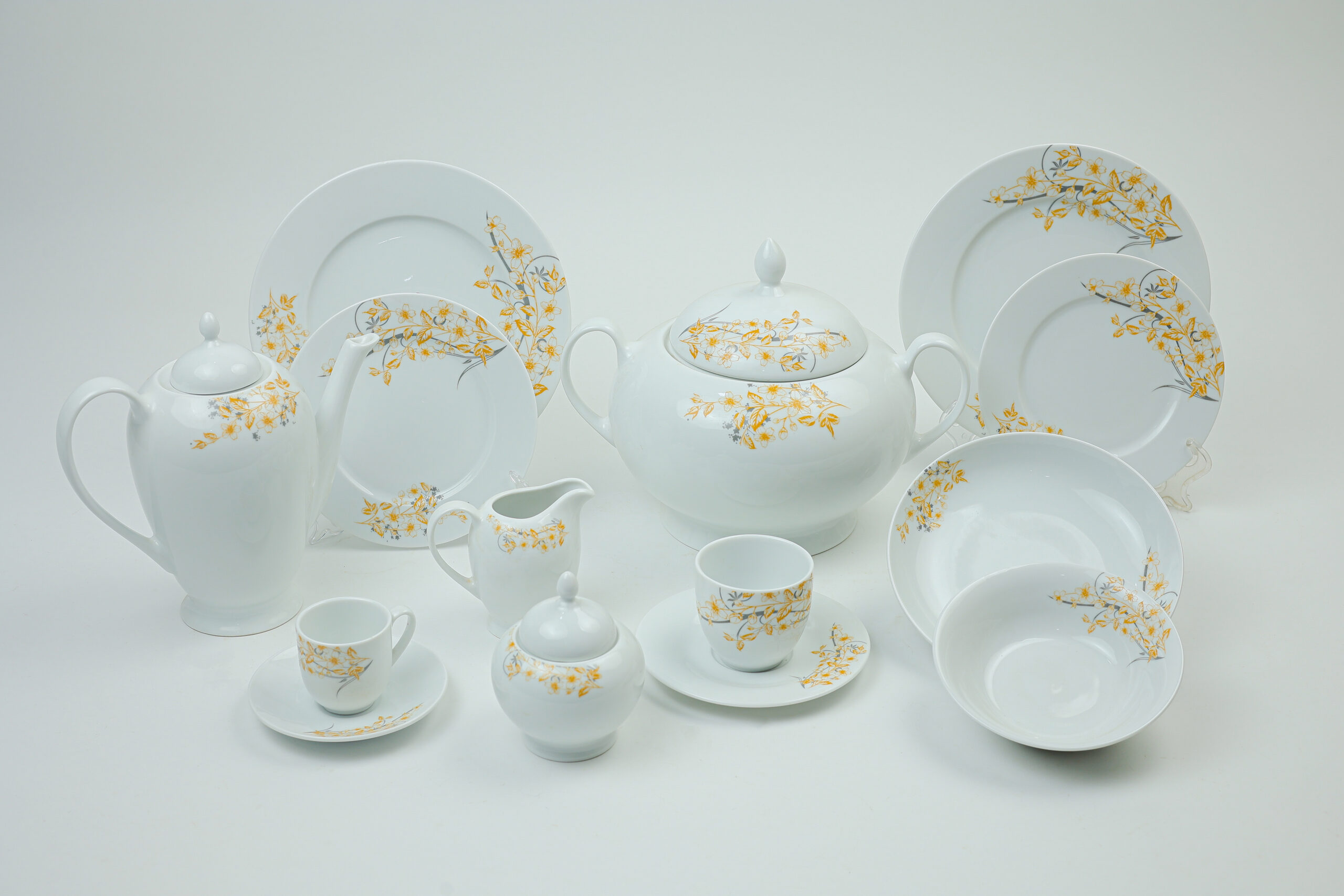 The tableware set features a modern geometric design, with square plates and a white base decorated with elegant gold and gray/silver patterns.