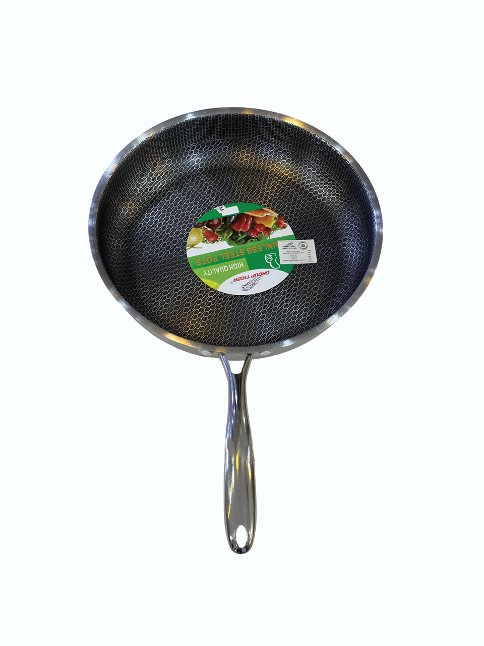 This image shows a hybrid stainless steel frying pan featuring a unique honeycomb-patterned surface. This design combines the durability of stainless steel with the easy cleaning of non-stick cookware.