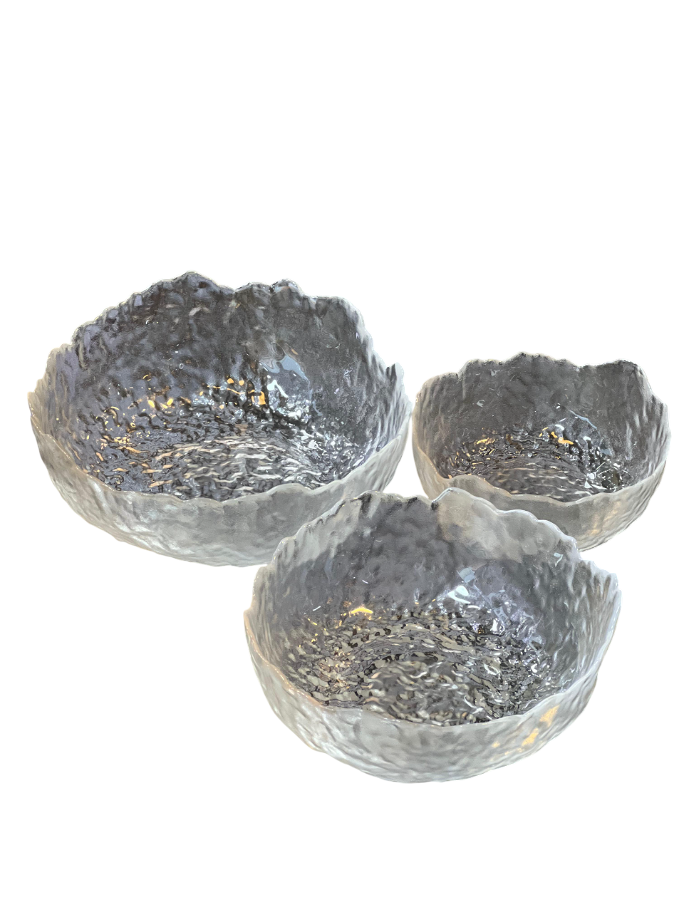 set of three textured glass serving bowls with a metallic or mercury glass effect finish. They feature a distinct hammered or ice-like pattern on the exterior and an irregular, wavy rim design.