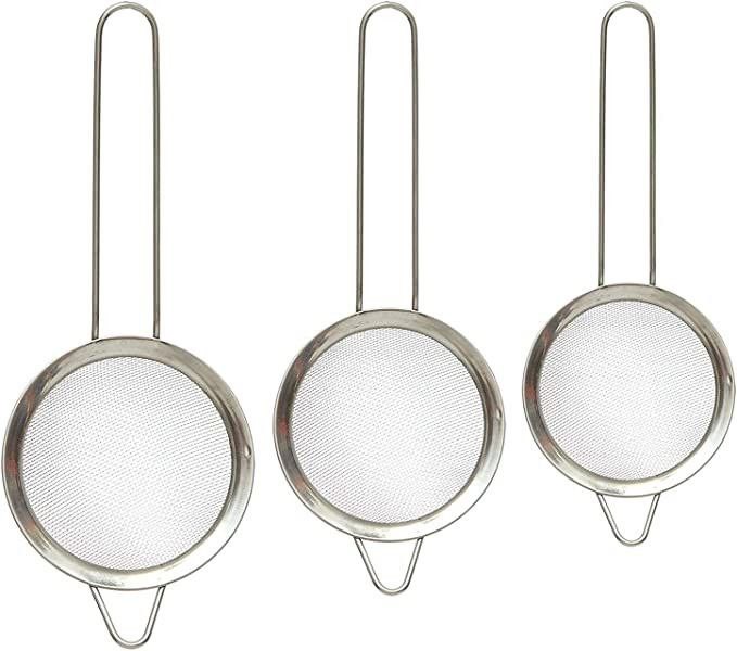 This set of items consists of three stainless steel fine-mesh strainers, also commonly referred to as sieves or colanders. These multi-functional kitchen tools are used to separate solids from liquids and for sifting dry ingredients.