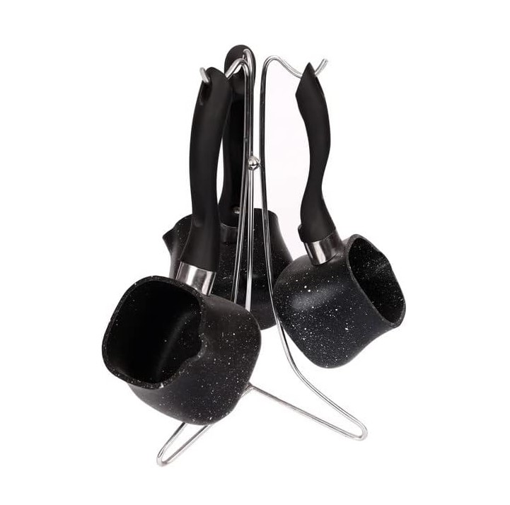 The image shows a luxurious granite coffee pot set, featuring a modern design with an elegant metal stand for organization and hanging.