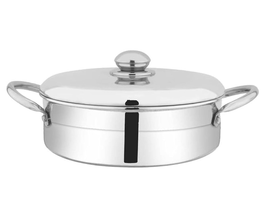 Design: Features a stylish, reflective finish, sturdy ring handles on the sides for easy lifting, and a matching stainless steel lid with a round handle.