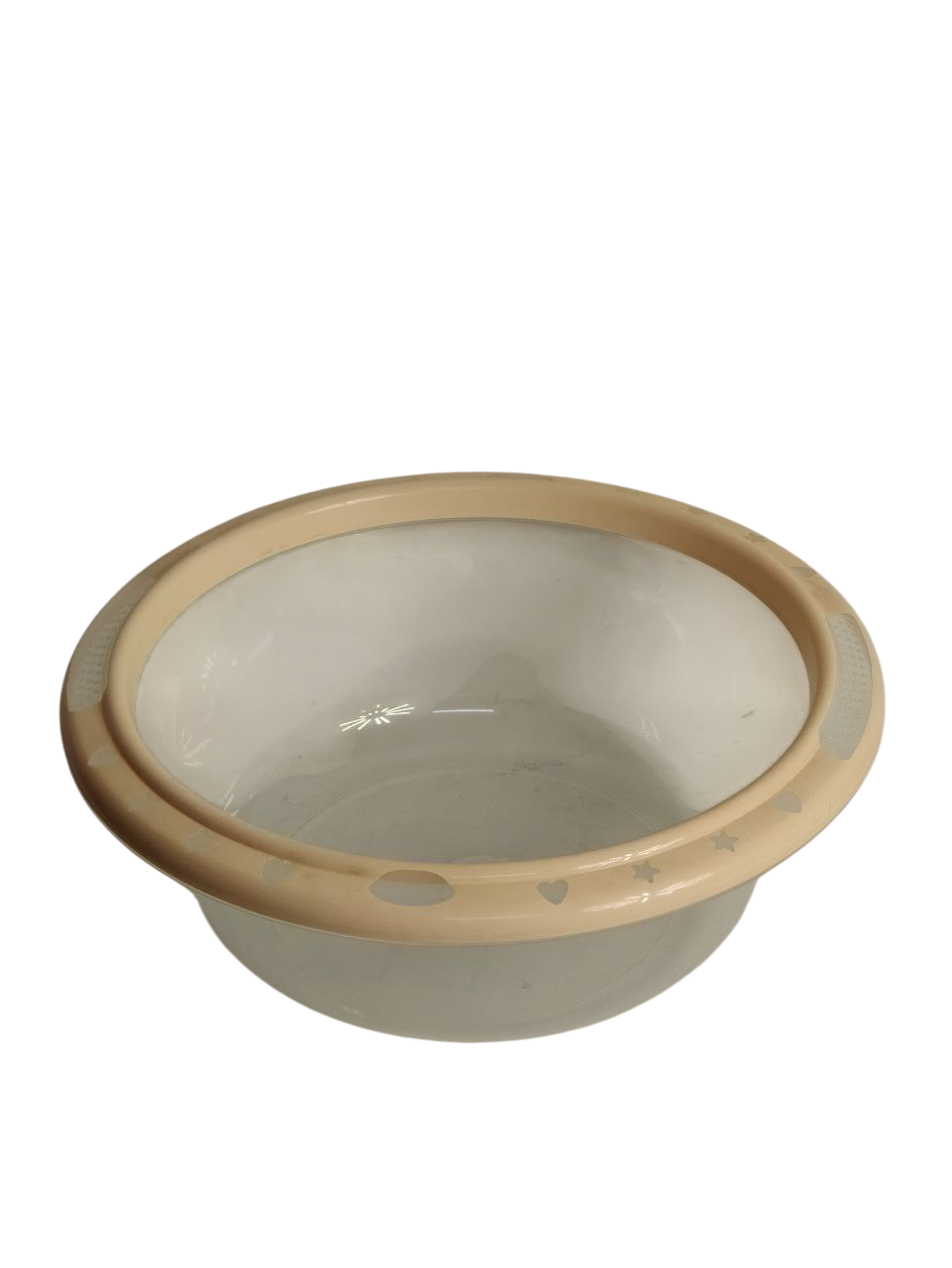A round, multi-purpose plastic bowl, commonly used in Egyptian homes for various purposes such as washing fruits and vegetables or as a general cleaning container.