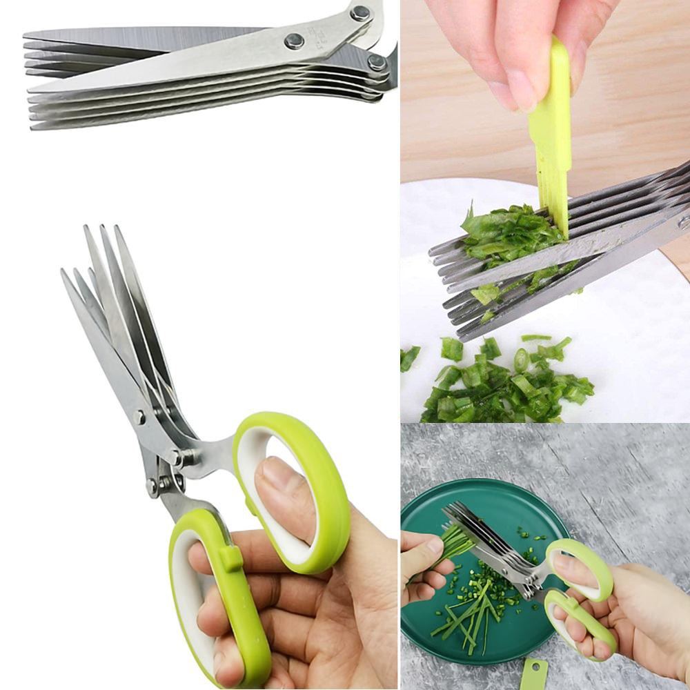pair of multi-blade herb scissors (also known as multi-layer kitchen shears or green onion scissors). They feature multiple (typically five) sharp stainless steel blades working simultaneously, designed to quickly and efficiently chop herbs, green onions, and other delicate greens into uniform pieces without a cutting board.