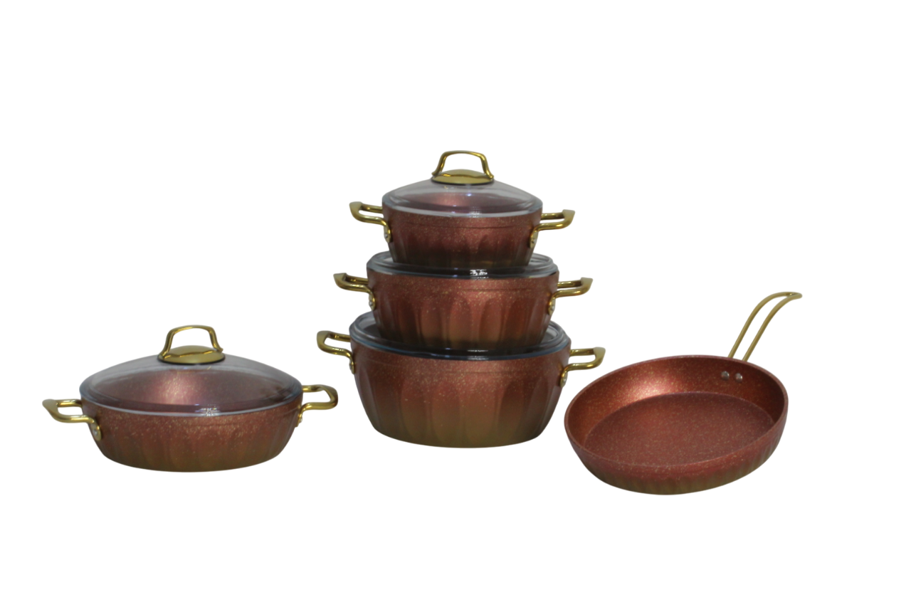 Material: Cookware typically features an aluminum base and a durable, non-stick granite coating. The coating has a copper-like color.