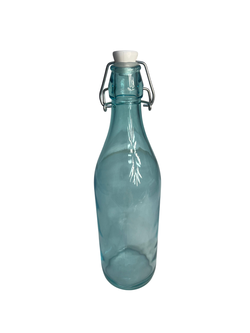 A clear glass bottle with a swing-out (or wire-clip) cap.