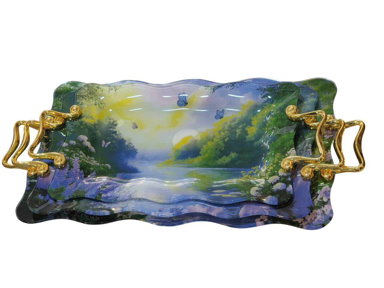 Design: The trays feature a vibrant natural scene with a river, trees, and butterflies under a soft, sunlit sky.