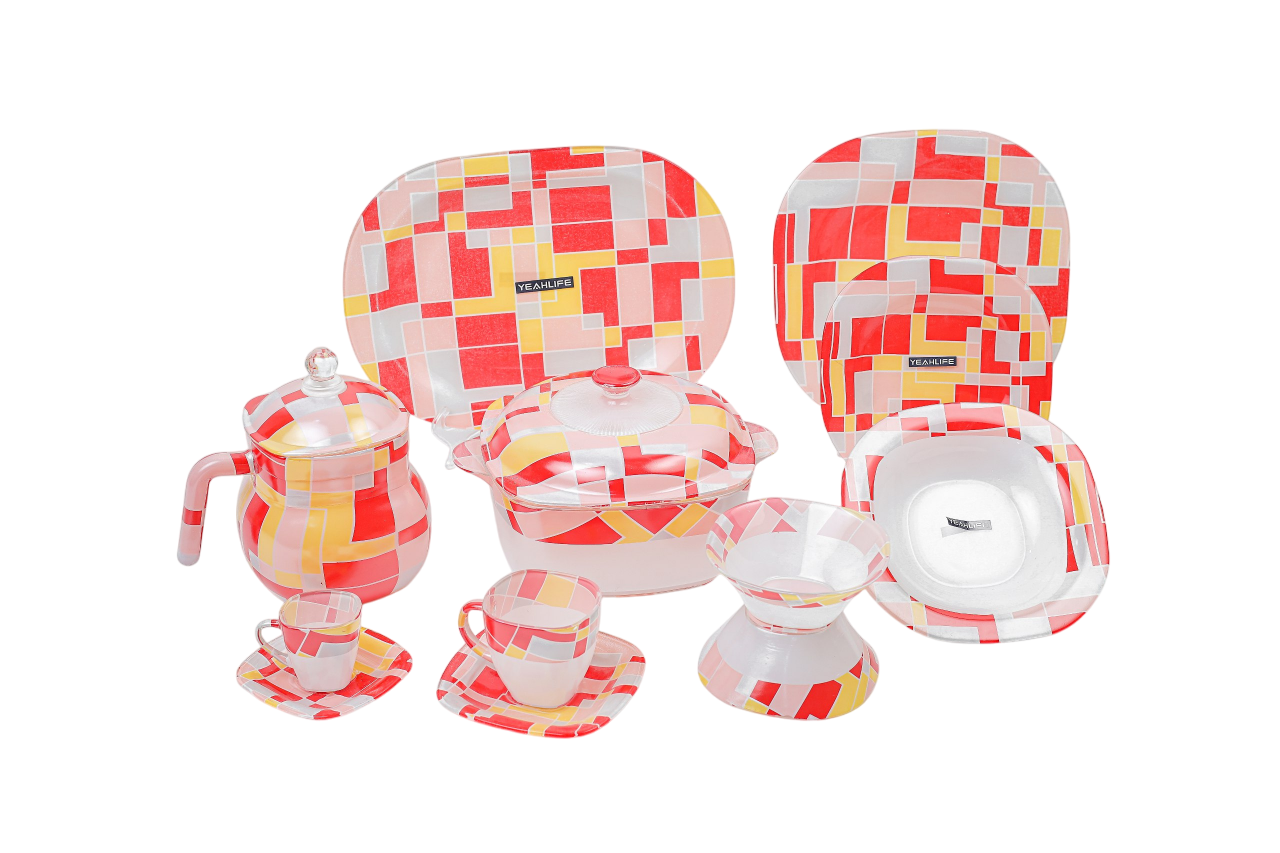 The dinnerware set , made from Arcopal glass and featuring a distinctive multicolored mosaic pattern of red, yellow, and white squares. It is available as a 58-piece .