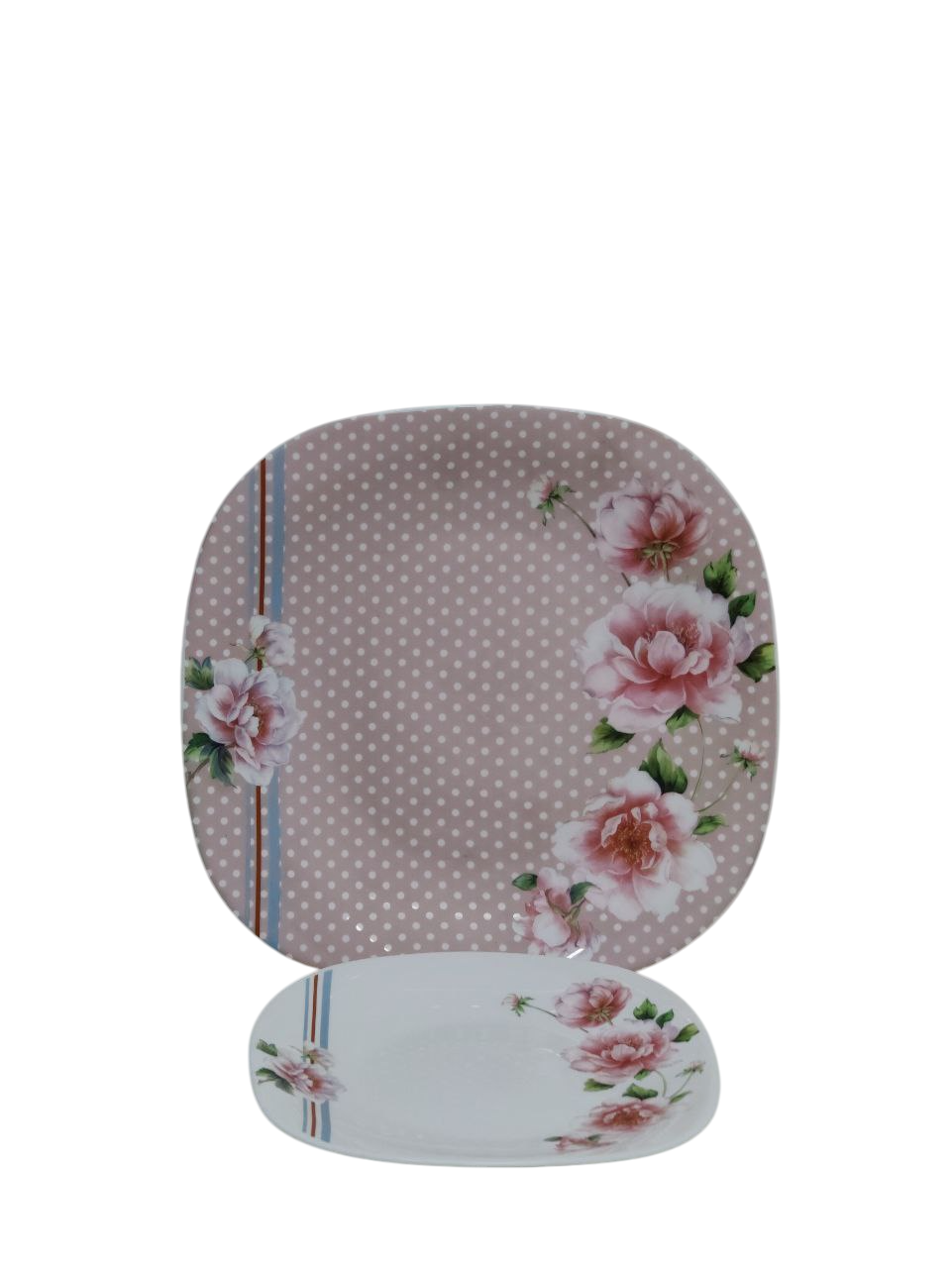 Arcopal square dinner set, featuring a distinctive white and pink dotted pattern with floral designs.
