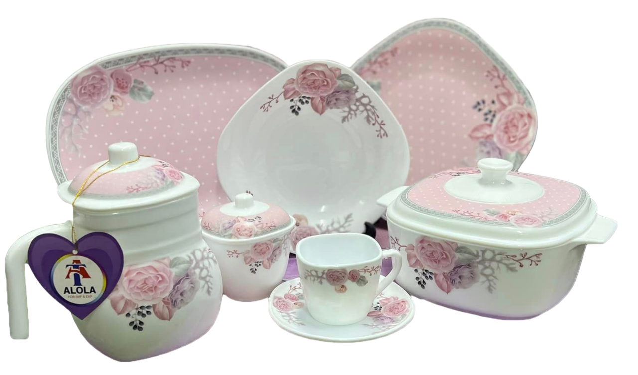 The dinnerware set, made of Arcopal or porcelain, featuring a distinctive pink floral and polka dot design. It includes various pieces such as plates, bowls, a large pot with a lid, and a serving pot or pitcher.