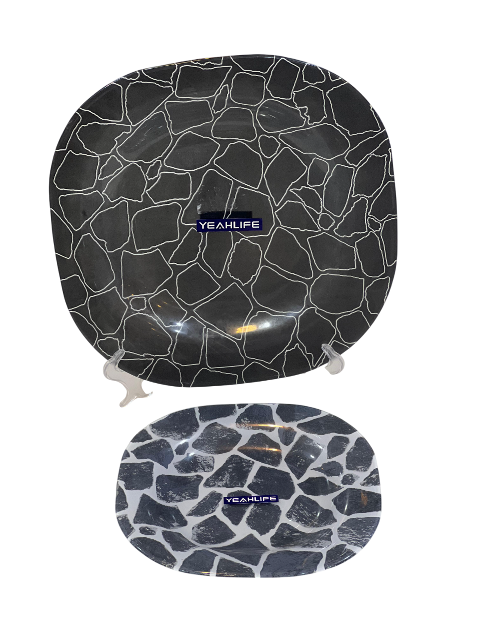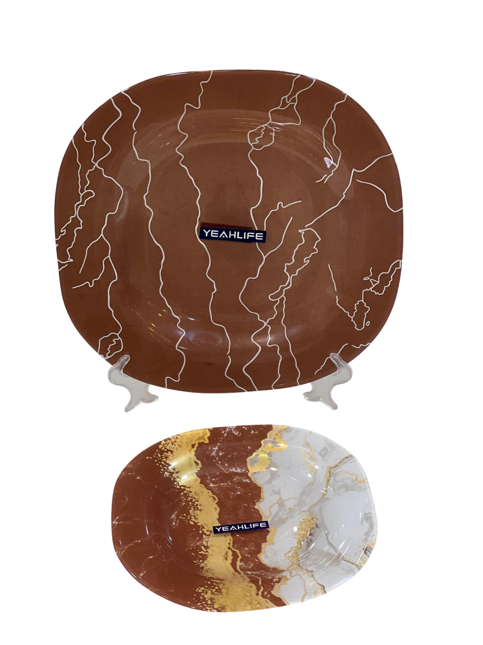 plates from a dinnerware set. The set is made of arcopal (a type of tempered glass known for its durability) and features stylish marble patterns.