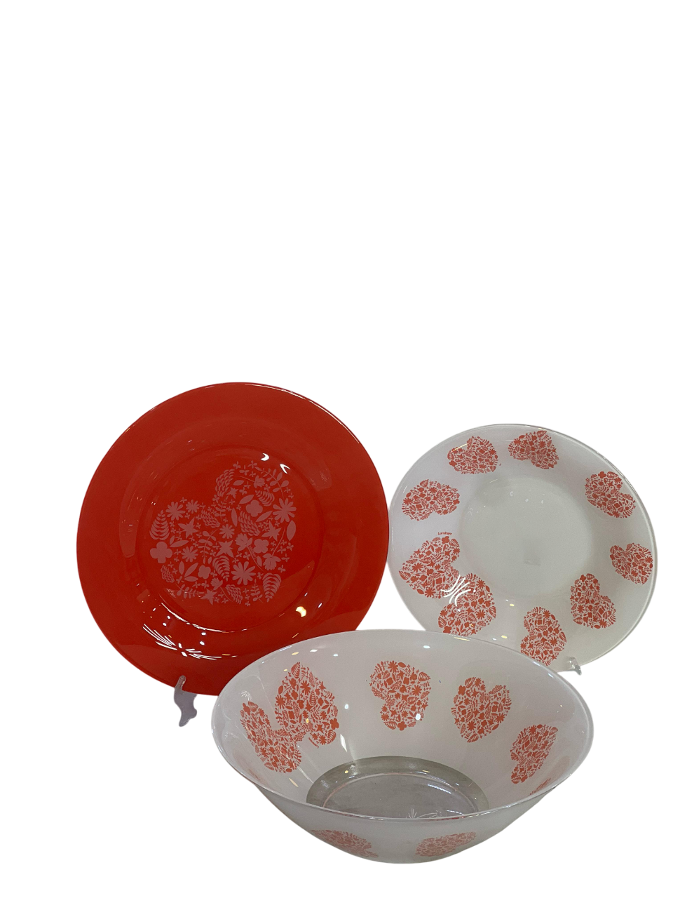 line known for its combination of solid red pieces and coordinating white dishes adorned with a delicate red heart/floral pattern. This specific pattern often features intricate, lace-like motifs that form the shape of hearts.