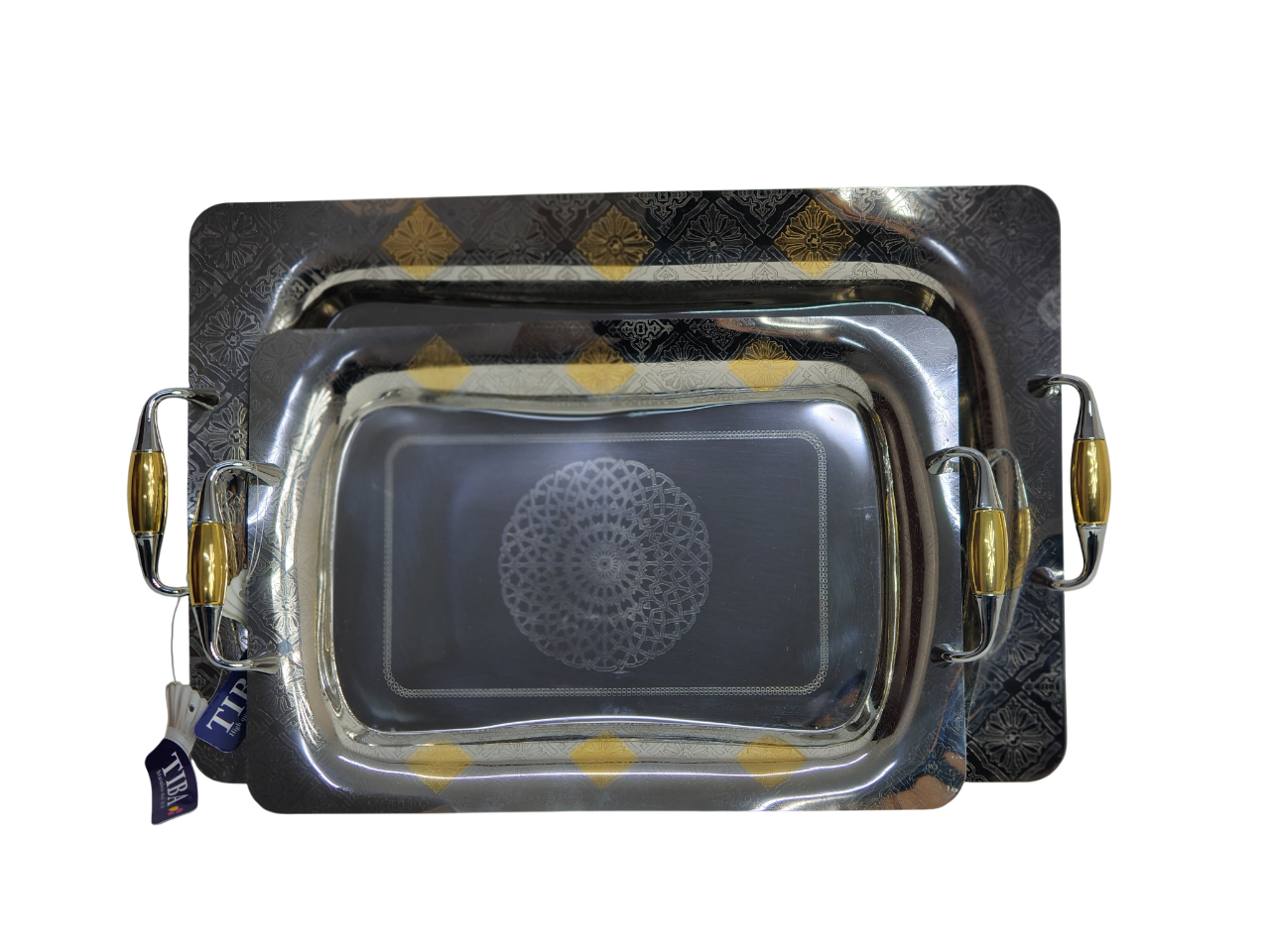 These serving trays are crafted from high-quality stainless steel in a striking silver and gold design. They feature a delicate and elegant pattern, and comfortable, gold-plated handles for easy carrying and use.