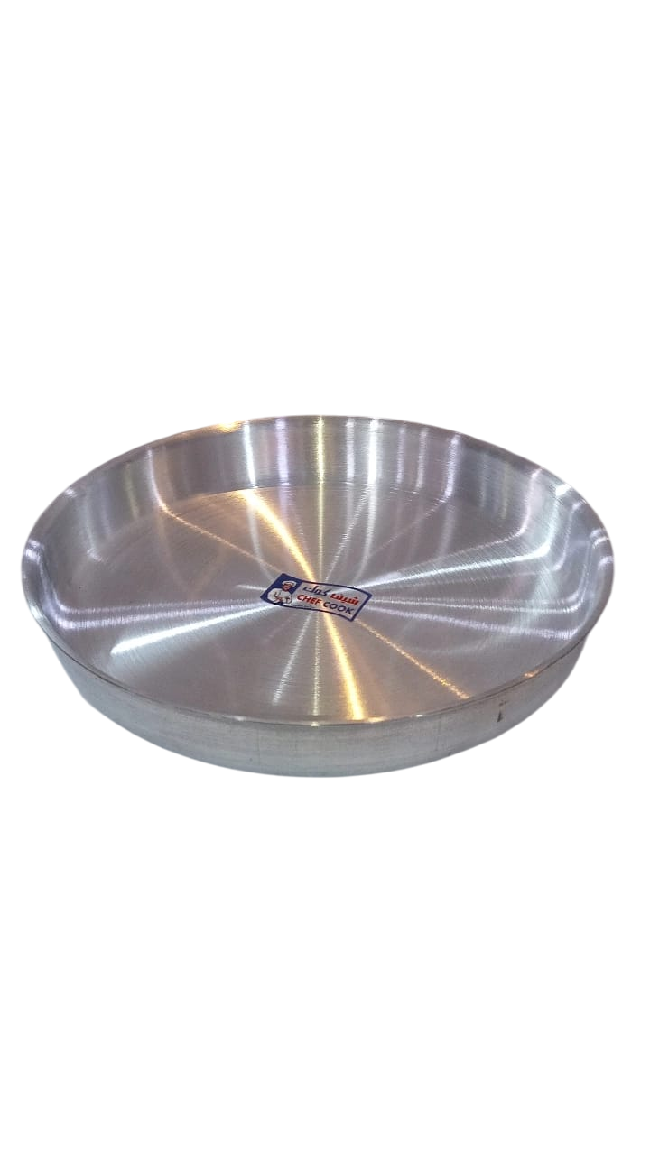This appears to be an aluminum baking pan, suitable for pizza, basbousa, or bread in general, and is typically available in various sizes. A small blue label on the pan reads “CHEF COOK,” suggesting a possible brand.
