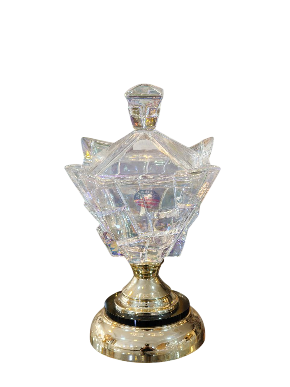 Design: This piece consists of a multifaceted crystal bowl with a matching pointed lid and an ornate base plated in gold or copper.