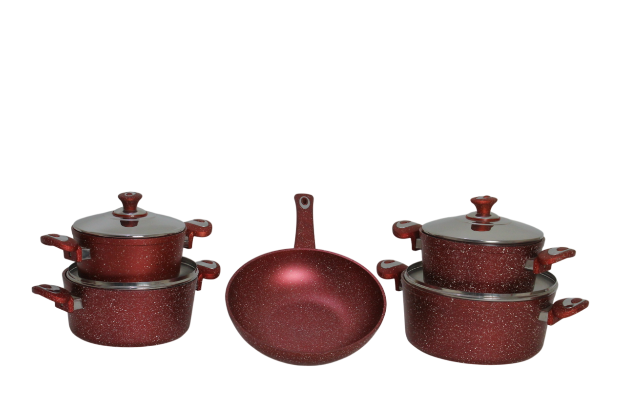 The image shows a 9-piece granite cookware set.