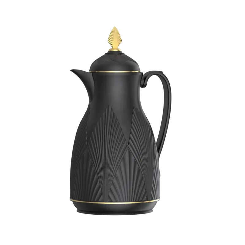 a black and gold vacuum flask, often designed in the style of a traditional Arabic coffee pot (Dallah). It features a geometric, fan-like pattern on the body and is part of a popular design line