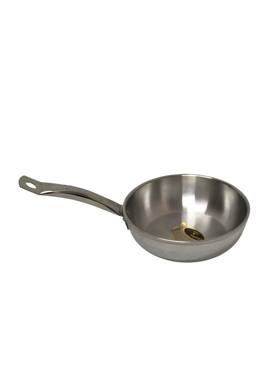 The image shows an aluminum frying pan with a long stainless steel handle. This type of pan is very popular in kitchens due to its versatility and ease of cleaning.