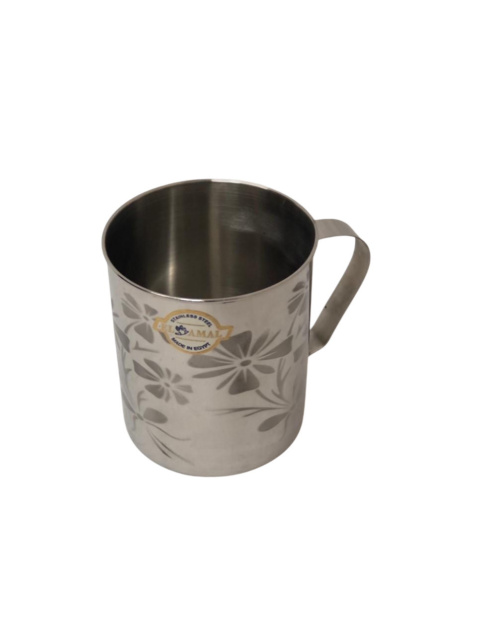 The product pictured is a decorative stainless steel mug from Amal Company.