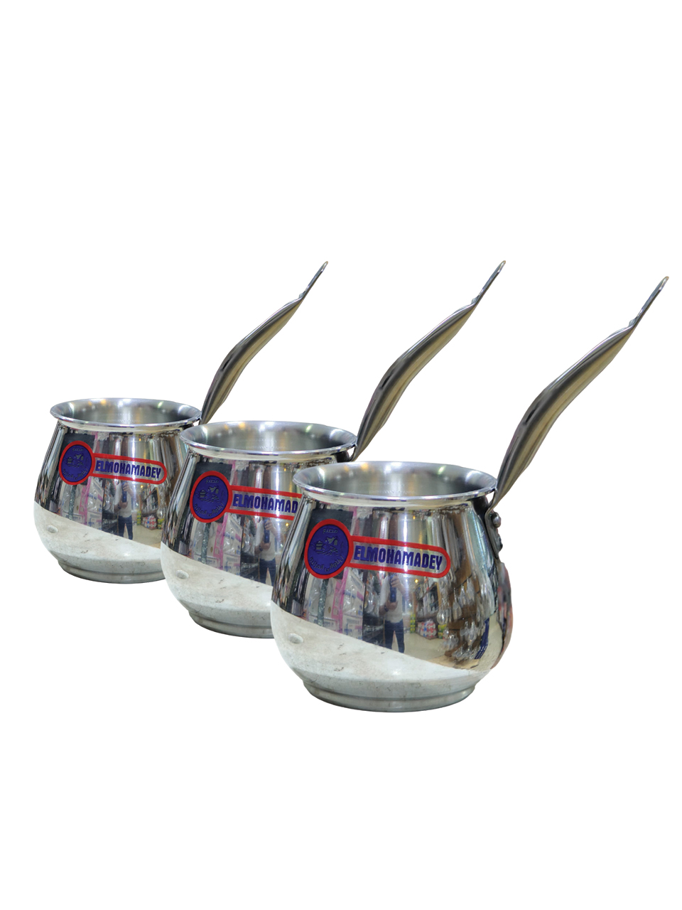 set of three nested coffee pots, also known as kanaka or cezve, which are traditional pots used for brewing Arabic or Turkish coffee. They are designed to be stacked for compact storage and are typically made from aluminum or stainless steel.