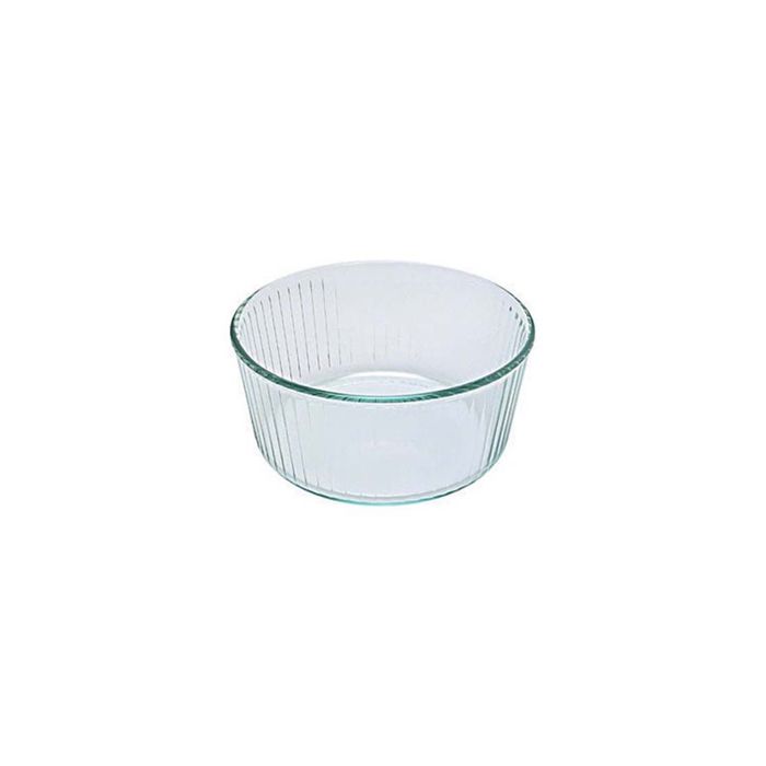 This is a Pyrex round glass soufflé dish. It features a transparent design made of high-temperature and thermal shock-resistant borosilicate glass.