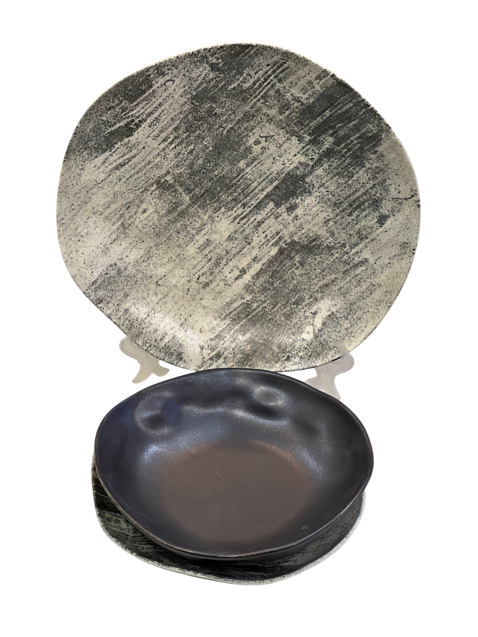 Design Style: The plates and bowls have an organic, freeform shape with uneven edges, designed to mimic natural forms. The finish is a matte or semi-gloss grey, sometimes with beige undertones, creating a stone-like appearance.