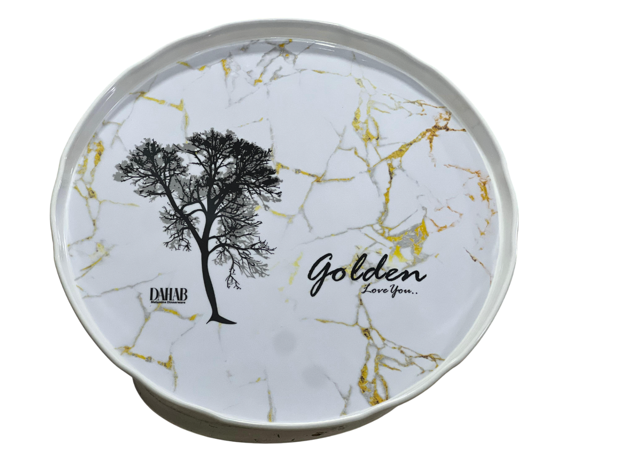 The serving tray shown in the image is a round melamine tray bearing the brand name “DAHAB” and decorated with a black tree design and a gold marble pattern.