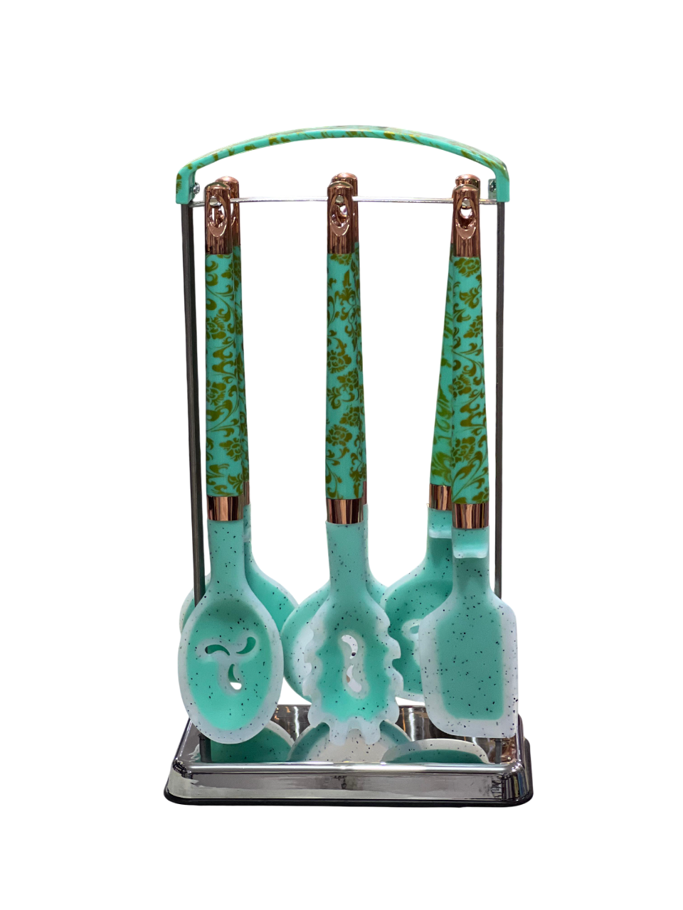 This 7-piece silicone serving set features a marbled or turquoise (light blue) floral design with brass or gold-tone handles and utensils, and comes with a stylish metal stand for organization.