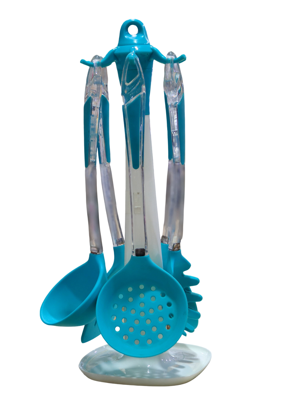 set of silicone kitchen utensils with a rotating or swivel display stand. a “7 Piece Silicone Dispenser Set” in a turquoise and white or similar .