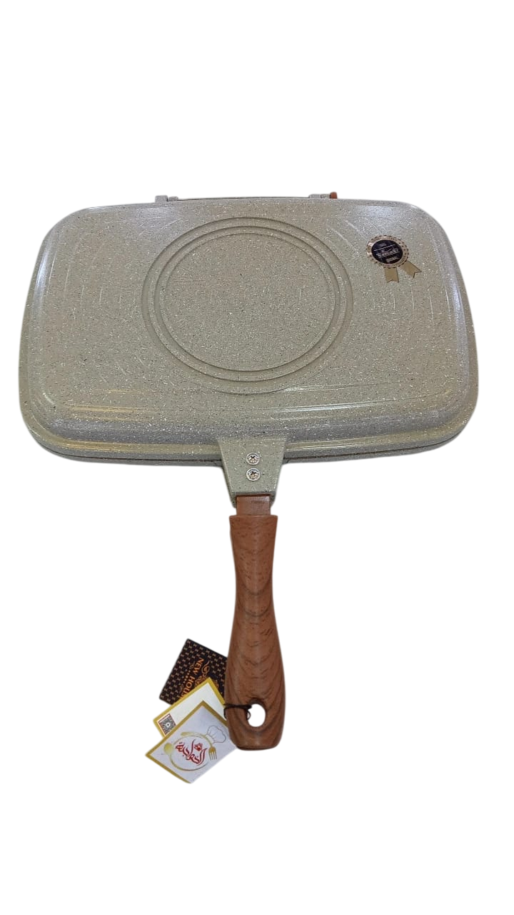 The pan shown in the picture is a double grill granite pan, also known as a “double-sided frying pan” or “double grill.”