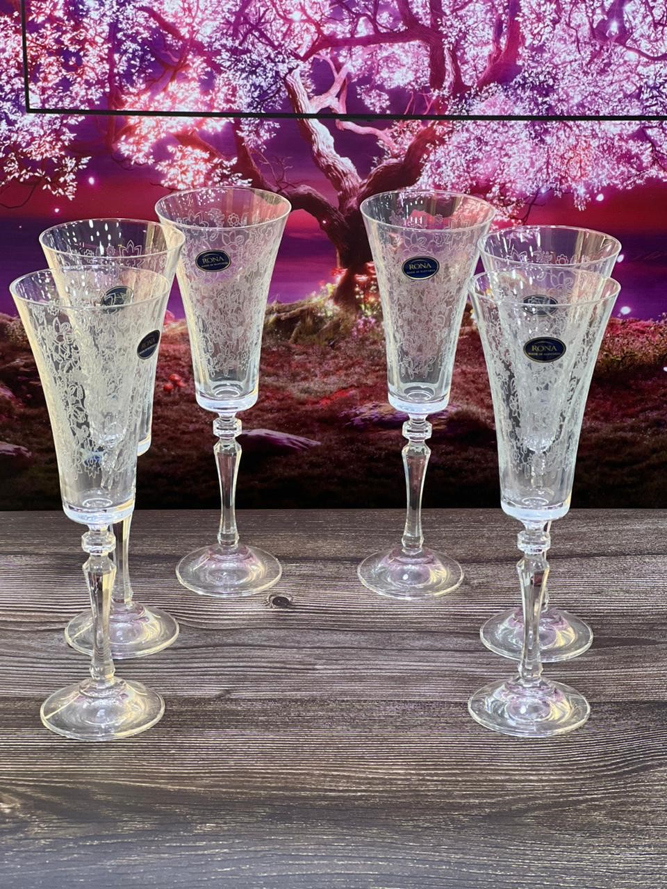 The glassware set pictured is from the “Stars and Flowers” collection by Rona Glass Works. This design features delicately engraved floral and star motifs on the bases of the glasses and pitcher.