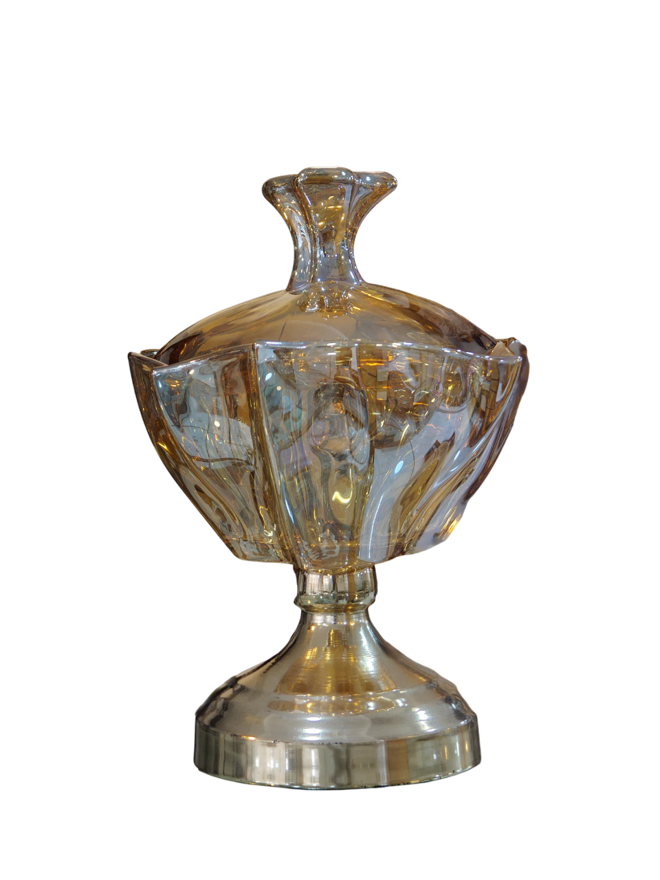 Material The bowl and lid are made of glass, featuring a fluted or twisted pattern. The base and knob appear to be a metal, often plated brass or a similar metallic finish.