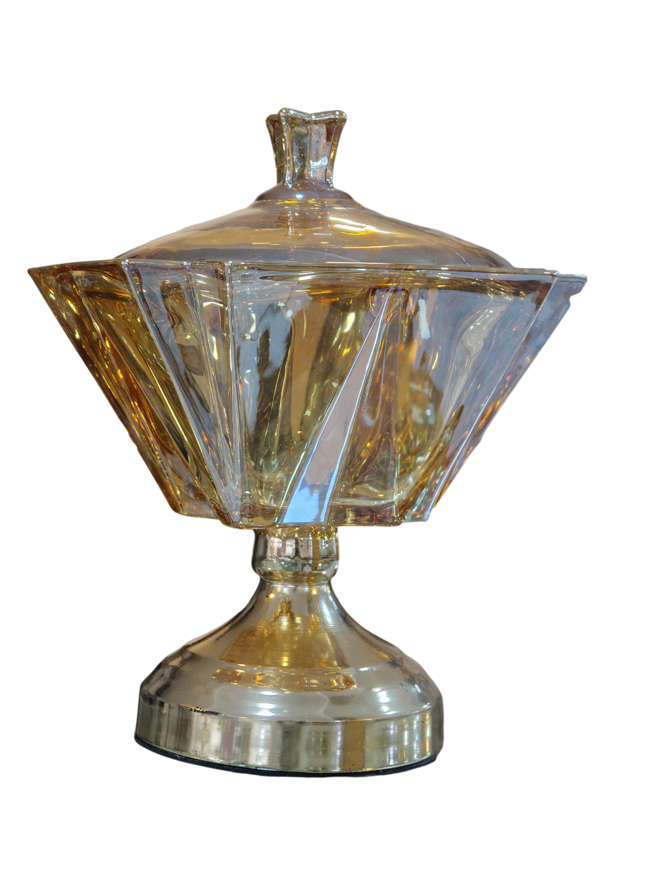 glass bonbonnière with a gilded or gold-colored base and lid finial. This type of container is commonly used as a decorative accent piece or for serving wrapped candies, a traditional use reflected in its name.