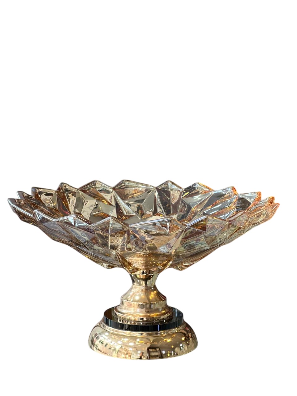 decorative crystal glass fruit bowl with a gold-finished metal base. It is designed in a modern, light luxury European style and is used as a centerpiece for dining tables, living rooms, or for serving fruits, desserts, and snacks.