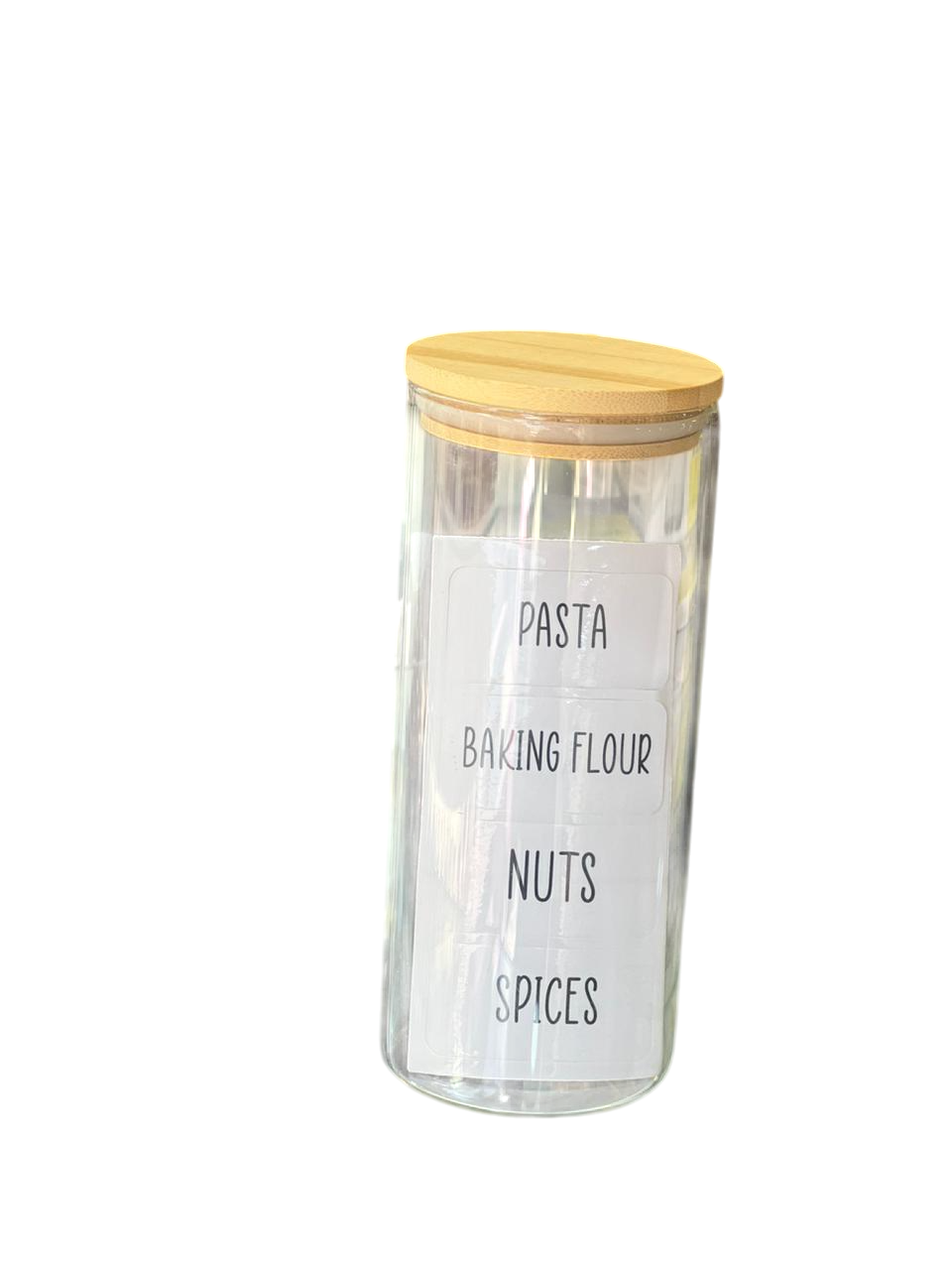 A clear glass storage jar with a bamboo lid, designed to organize kitchen essentials. It comes with pre-printed labels for words like “PASTA,” “BAKING FLOUR,” “NUTS,” and “SPICES.”