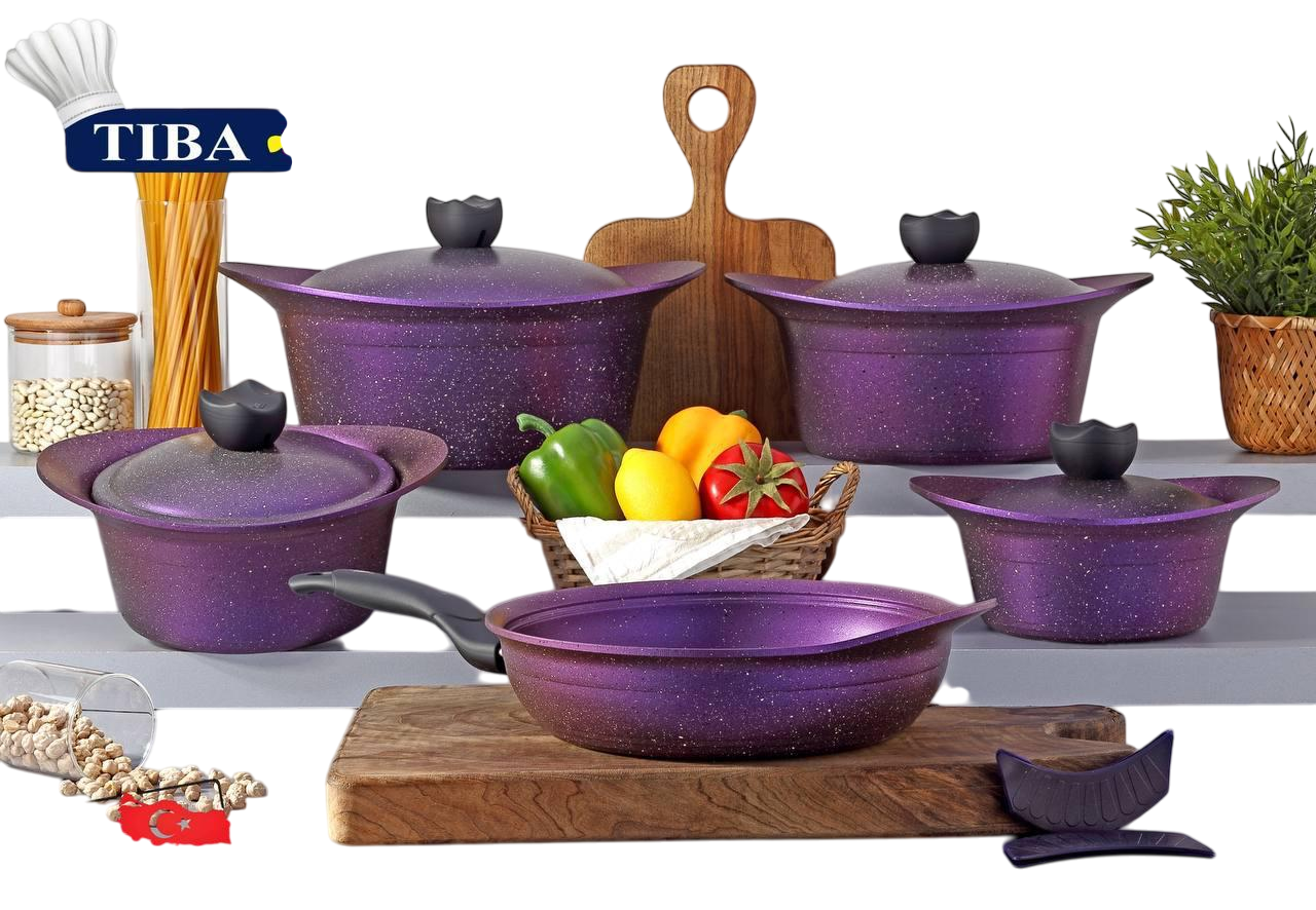 This is a purple granite cookware set from the Turkish brand TIBA. This set is known for its non-stick and scratch-resistant finish, making it practical and durable for everyday use.
