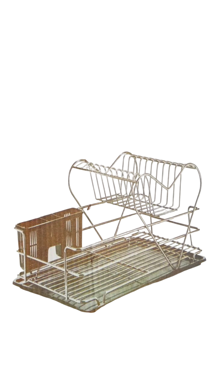 two-tier wire dish drying rack with a heart-shaped frame and a detachable plastic draining tray and cutlery caddy. It is also known as a dish drainer or dish strainer.