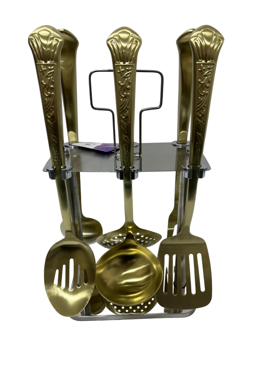 This image shows a 7-piece gold-plated stainless steel titanium laser-cut serving set.