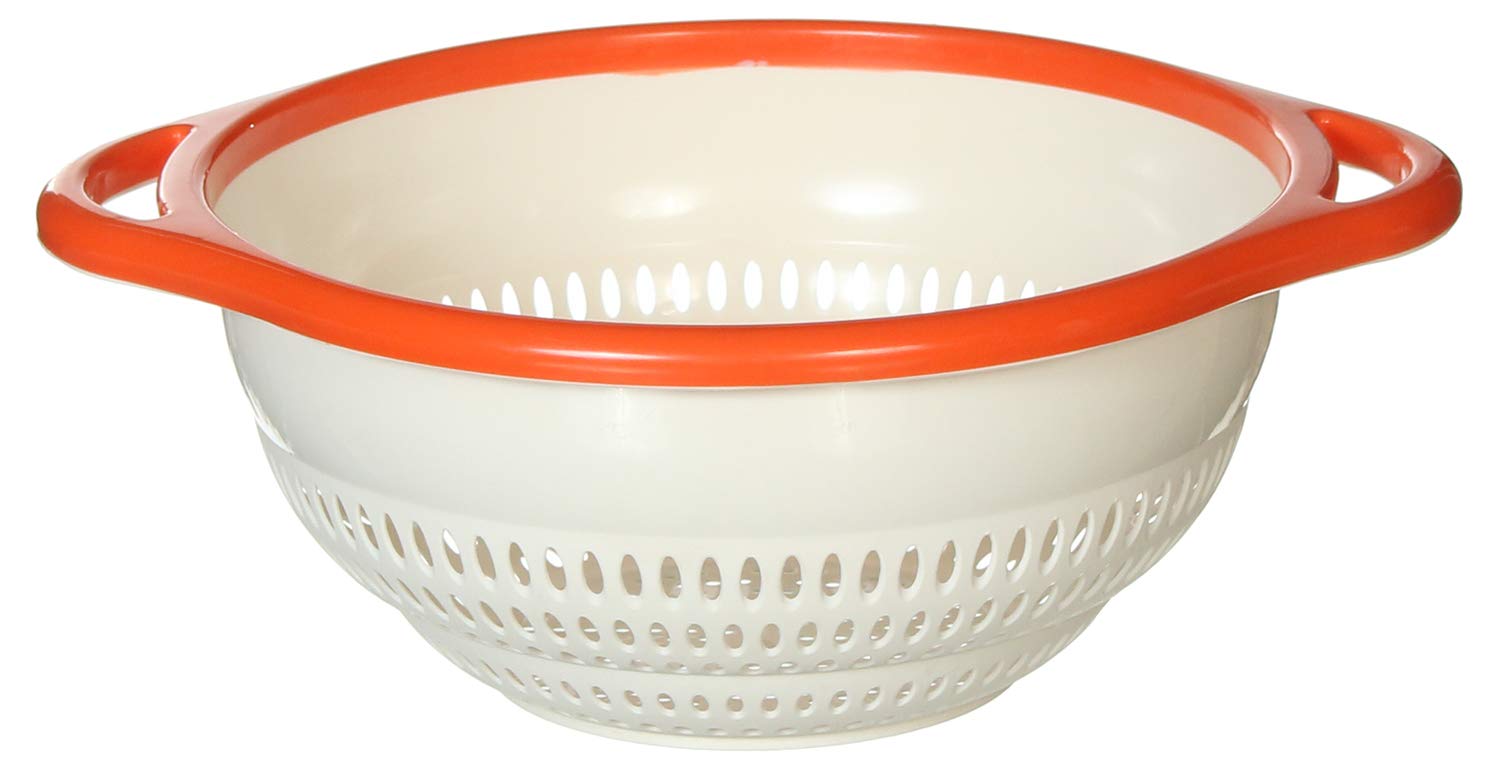 The plastic colander shown in the image is a commonly used kitchen product, also known as a “round plastic food colander” or “vegetable colander.” This particular model features an ivory white finish with a bright orange rim and handles.