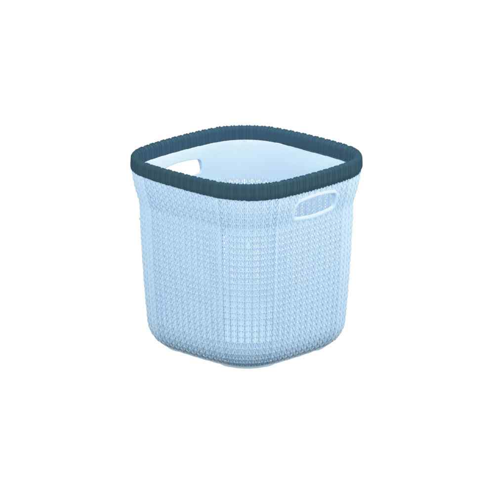 small, light blue, plastic basket. It features a stylish, textured woven pattern.