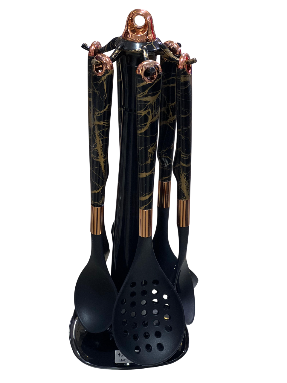 Complete Set: Includes six utensils: an instant spoon, ladle, slotted spoon, slotted stirring spoon, flat spatula, and serving spoon, plus a rotating storage rack.
