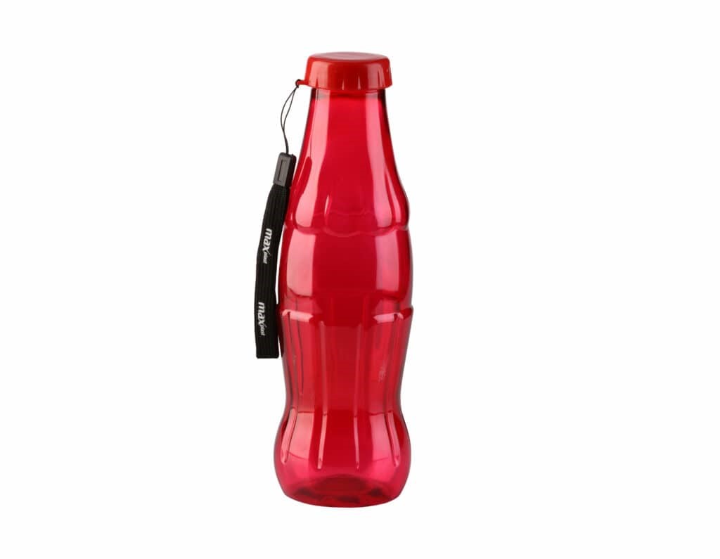 This is a plastic water bottle shaped like a classic Coca-Cola bottle.